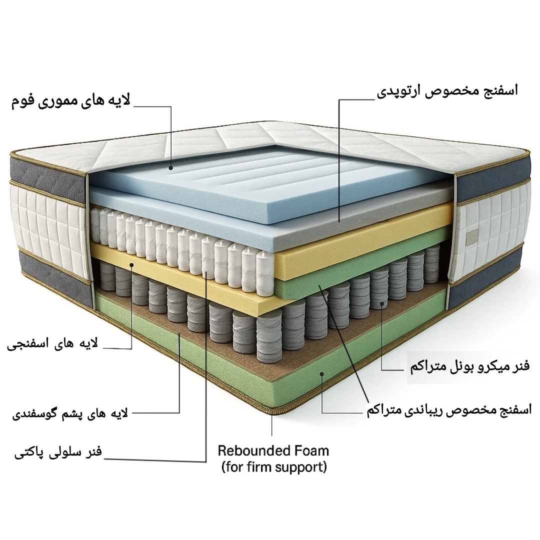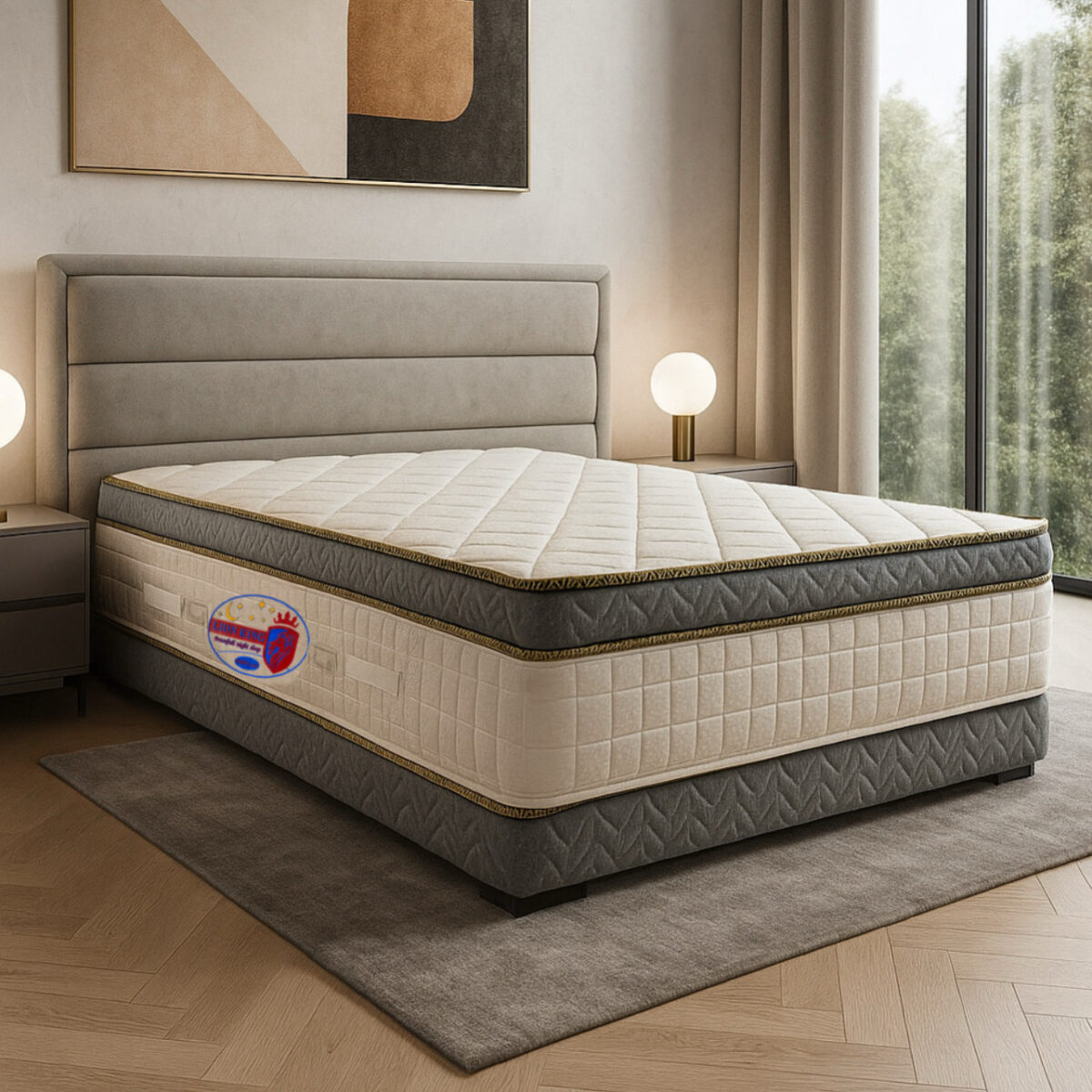 تشک لاین کینگ مدل سوپر کینگ اسلیپ در دسته بندی تشک های طبی فنری قرار میگیرد که مناسب برای افراد تا 160 کیلوگرم برای هر نفر بوده و درجه ی نرمی این تشک برای هر طرف به ترتیب 6.5 از 10 و 3.5 از 10 می باشد این به آن معناست که قابل استفاده از دو طرف تشک می باشد به شکلی که یک طرف آن نسبتا رو به سفتی و سمت دیگر رو به نرمی میرود .تشک سوپر کینگ در لاین تشک های دو طرف پد پدار وی آی پی شرکت لاین کینگ قرار میگیرد که با حساسیت بسیاری در شرایط تولید خاص به همراه تیمی متخصص با بکارگیری بهترین متریال وارداتی تولید میشود از این رو قابل قیاس با تشک های روز اروپایی می باشد .هسته ی مرکزی این تشک اسکلت فنری از جنس میکروکربن ریز بافت متصل بوده که در طول و عرض آن تعداد فنر های استوانه ای بیشتری نسبت به سایر تشک ها دارد که تقویت شده و این امر سبب دوام و استحکام بیشتر میشود و همچنین کیفیت محصول را افزایش میدهد. بعد از اسکلت لایه های نمدی عایق صدا و دما وجود دارد که سر تا سر فنر را در بر میگیرد ؛ لایه ی بعدی اسفنج سرد متراکم می باشد که در هر دو طرف تشک کار شده و عایق صدا و ارتعاش است و وجود این لایه باعث میشود تا لرزش و حالت ارتجاعی به حداقل برسد. در پد قسمت بالای محصول متصل این تشک که قطر 10 سانتی متری دارد لایه های اسفنج متراکم ریباندی 100 کیلویی با دانسیته ی بالا و لایه های اسفنجی مخصوص ارتوپدی و همچنین لایه ای نمدی غلطک خورده از پشم گوسفند قرار دارد که وجود این لایه ها سلامت ستون فقرات و کمر و زانو را تضمین میکند وجود دارد ؛ در سمت دیگر این تشک پد دیگری است که از یک لایه فنر میکرو سلولی پاکتی و اسفنج یورولوکس 60 کیلویی با دانسیته بسیار بالا و یک لایه اسفنج مموری فوم سر تا سری تشکیل شده که بر خلاف پد سمت دیگر محصول یک پد نرم با ایجاد حالت معلق بودن و احساس بی وزنی است که تماما حالت بدن فرد را به خود میگیرد و کیفیتی فوق العاده در کنار آرامش را تشکیل میدهد. لایه ی آخر این محصول پارچه ی الیاف پنبه ای گرم بالا ی ابر دوزی شده می باشد که ضد حساسیت و تعریق است و موجب تنفس و گردش هوا هنگام خواب میشود همچنین برای گردش هوای بیشتر دو کپسول تخلیه هوا در دیواره ی تشک کار شده است که این نیز برای گردش هوای بیشتر و سلامتی و کیفیت خواب دارای اهمیت بالایی می باشد .ارتفاع تشک 1±50 سانتی متر می باشد.